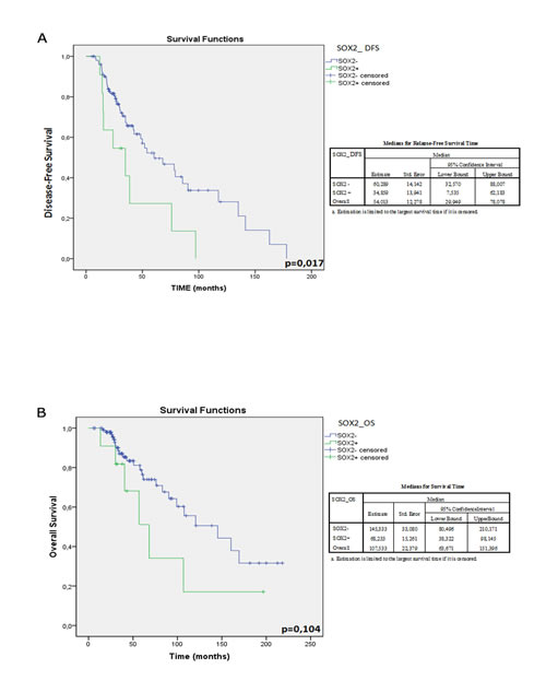 We used a univariate and multivariate Cox model for DFS and OS to identify the prognostic role of the expressed stemness genes. A statistically significant higher risk of recurrence was observed in 9 out of 11 patients (82%) with tumors expressing SOX2 mRNA (SOX2+) compared to 44 out of 106 (42%) without SOX2 expression (SOX2-) (p=0.017; χ2=5,740). Interestingly, SOX2+ patients experienced an earlier recurrence (median: 34.9 months; 95% CI: 7.5-62.2) than SOX2- patients (median: 60.3 months; 95% CI: 32.6-88.1), as shown by curves K-M in Figure 3A. Consistently, OS resulted shorter in SOX2+ compared to SOX2-: 145.3 months (95% CI: 80.5-210.2) vs. 68.2 months (95% CI: 63.7-151.4), respectively, albeit not statistically significant (p=0.104) (Figure 3B). The analysis of other genes (ERAS, NANOG, SOX 15, TCL1, BMI1, KLF4, SALL4 and GDF3) did not show any statistically significant correlation with DFS and OS (data not shown).