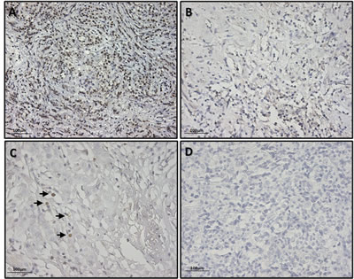 Figure 5: Exemplificative pictures of immunohistochemical staining of SOX2 showing different expression levels in BC tissues. (A) Breast cancer tissue showing an high number of SOX2 positive cells; (B) Breast cancer tissue showing a moderate number SOX2 positive cells ; (C) Breast cancer tissue showing a low number SOX2 positive cells (black arrows); (D) Breast cancer tissue showing no SOX2 positive cells. Pictures were taken with 200X magnification.