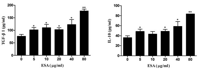 TgESAs-induced anti-inflammatory cytokine secretion was examined in Ana-1 macrophages using ELISA. Compared with control, TgESAs significantly increased IL-10 and TGF-β1 secretion (*P < 0.05, **P < 0.01) in Ana-1 cells according to dose (Figure 5).
