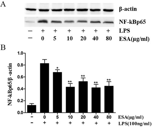Figure 7: Effect of TgESAs on the activation of NF-kB, detected by Western blotting. (A) The nuclear NF-kB protein expression of Ana-1 macrophage cells that were treated with 0, 5, 10, 20, 40 or 80 μg/ml ESAs from T. gondii for 48 h before LPS stimulation at 100 ng/ml for 1 h. (B) The results were analyzed by Quantity One software and stated in NF-kB vs β-actin. Values are mean ± standard deviation of three independent experiments. *P < 0.05 and **P < 0.01 compared with control group (0 μg/ml TgESAs plus LPS).