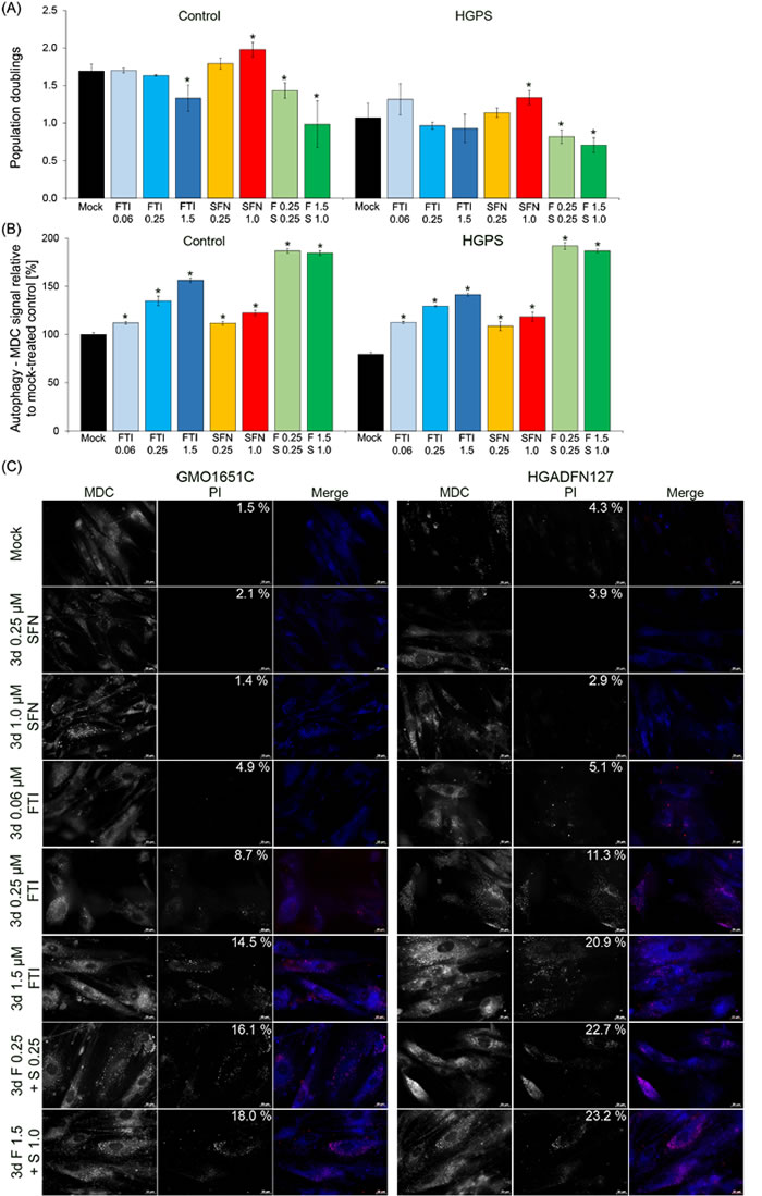 To further investigate why the cells treated with both compounds exhibited reduced growth, we performed immunohistochemistry to detect autophagosomes with monodansylcadaverine (MDC) and cell death with propidium iodide (PI) on living cells (Figure 1C). In the mock-treated control and HGPS cells, the signal for MDC was visible in the control cells and was weaker in the HGPS cells (Figure 1C, panel Mock). The percentages of PI-positive cells (signifying dead cells) are indicated on the PI images. The percentage of dead cells among the mock-treated HGPS cells (4.3%) was higher than that in the mock-treated control cells (1.5%). Increased levels of autophagosomes and cell death were observed in control and HGPS cells that were treated with FTI and SFN together at concentrations of 0.25 μM each (Figure 1C). At these concentrations the percentages of dead cells increased significantly in both control (16.1%) and HGPS (22.7%) cultures. Hence, PI-positive cells were brightly stained with MDC as shown in the merged images (Figure 1C, FTI 1.5 μM and combined drug treatments). This finding indicates that treatment with both drugs combined activated autophagy to levels that become toxic as indicated by the increased levels of cell death (Figure 1C).
