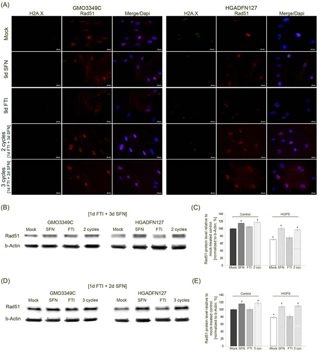 In addition to the status of 53BP1, we investigated Rad51, another DNA damage repair factor that activates homologous recombination (Figure 8A). The levels of Rad51 were decreased in mock-treated HGPS cells compared to their control counterparts (Figure 8B). Immunofluorescence staining of Rad51 revealed some bright foci in HGPS cells that were not co-localized with γH2A.X foci (Figure 8A). After SFN and FTI/SFN intermittent treatment cycles, HGPS cells showed an increase in Rad51 signal throughout the nucleus and at sites of γH2A.X foci as observed in mock-treated normal cells. After FTI treatment, Rad51-stained foci were not co-localized with γH2A.X foci in HGPS cells (Figure 8A). Rad51 protein levels were increased in HGPS cells treated with SFN alone or with cycles of FTI/SFN regimens (Figure 8B-8E). Collectively, our findings indicate that treatment with SFN alone or with FTI/SFN intermittent treatment cycles efficiently raised the levels of both 53BP1 and Rad51, thus improving DNA damage repair processes in HGPS cells.