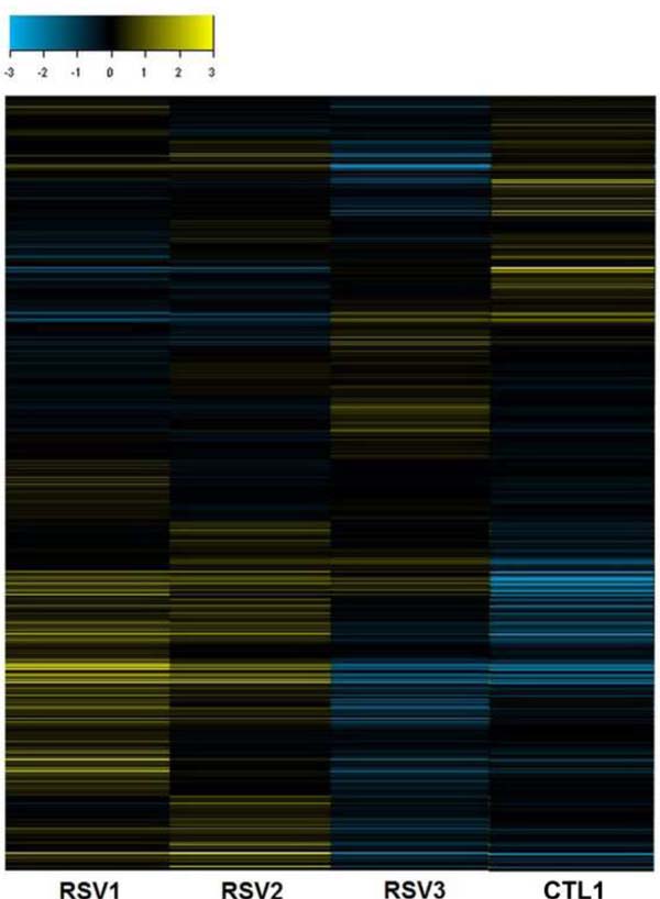 Three RSV infection samples and one healthy control sample (CTL) were analyzed using miRNA microarrays. The microarray assays were performed by the Affymetrix GeneChip® miRNA 4.0 expression profiling kit at Affymetrix, Inc (Santa Clara, CA). The microarray contained probes for 5214 human miRNAs and generated fluorescent miRNAs with a sample input of 130 ng of total RNA. Labeling was performed using FlashTag™ Biotin RNA Labeling Kit (Genisphere Inc. Hatfield, PA) containing Poly (A) Tailing and FlashTag Ligation. The array hybridization cocktail was prepared. The mixture was incubated at 99 °C for 5 minutes, then 45 °C for 5 minutes. Subsequently, the mixtures were transferred to both septa of a microarray slide, and the arrays were placed into hybridization oven and incubated at 48 °C and 60 rpm for 16 hours. The slides were then washed with washing buffer (Affymetrix Inc, Santa Clara, CA), and scanned immediately by the GeneChip® Scanner 3000 (Affymetrix Inc, Santa Clara, CA). Data collection and quality assessment were performed using Affymetrix®GeneChip® Command Console®Software (Affymetrix Inc, Santa Clara, CA). The signal intensity of individual miRNA probes was expressed as a ratio of the internal control. Microarray results are deposited in the NCBI’s Gene Expression Omnibus.