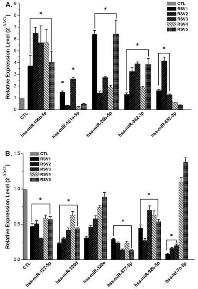 In this study, miRNA expression profiles were analyzed in peripheral blood of infants with acute RSV infection, and differential expression of miR-106b-5p, miR-20b-5p, miR-342-3p, miR-877-5p, miR-122-5p, miR-320e, miR-320d, and miR-92b-5p was confirmed by qRT-PCR. The function analysis revealed that the miRNAs participate in signaling pathways involved in inflammation and immune responses.