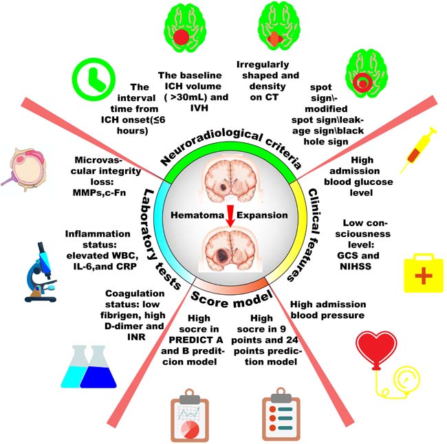 Intracerebral hemorrhage (ICH), which accounts for 10-15% of stroke, is the most lethal form of stroke with more than 40% 30-day mortality compared to ischemic stroke [1, 2]. Hematoma expansion (HE), which occurs in approximately 33% ICH patients, is identified as one important independent predictor of early neurological deterioration and poor long-term clinical outcomes [3, 4]. However, several therapeutic treatments targeting HE, including early aggressive blood pressure lowering treatment and receiving recombinant activated factor VII (Ravia), have different conclusions of clinical outcome improvement in large randomized controlled trails [5, 6]. For example, in the Second Intensive Blood Pressure Reduction in Acute Cerebral Hemorrhage Trail (INTERACT2), lowering intensive blood pressure showed a borderline significant effect on better primary outcome. Their outcomes may result from the indiscriminate enrollment of patients with low rates of HE. In addition, some patients destined to experience HE were excluded from emergency surgery. Based on that supposition, more attention has been paid on better stratification of patients, especially patients destined to undergo HE. Therefore, it is important to find those HE predictors to stratify patients and tailor intensive therapies timely and effectively for high-risk patient. Several retrospective studies have identified different individual potential predictors using various methodologies, but results are conflicting (Table 1) [7-9]. In this review, we summarize and classify those potential predictors by clinical, laboratory, radiographic, and integrated score models. We discuss their underlying pathophysiology and future therapeutic strategies on HE prediction or prevention.
