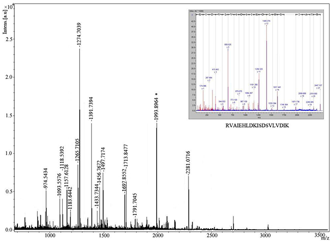 Figure 2: Identification of protein spot 2 recognized by sera from patients with NSCLC by mass spectrometry. The identification of CCT5 was performed by MALDI-TOF MS after trypsin digestion of the protein. Inset: The tandem mass (MALDI-TOF/TOF) spectrum of one peptide, M/Z=1993.8964 (starred).