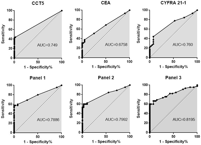 Figure 3: ROC curves for CEA, CYFRA21-1, autoantibody against CCT5 and their panels of two or three of the three proteins combined. ROC curves for 45 patients with NSCLC and 40 healthy subjects. The AUC is indicated. Panel 1: autoantibody against CCT5 combined with CEA, Panel 2: autoantibody against CCT5 combined with CYFRA 21-1, Panel 3: autoantibody against CCT5 combined with CEA and CYFRA 21-1.
