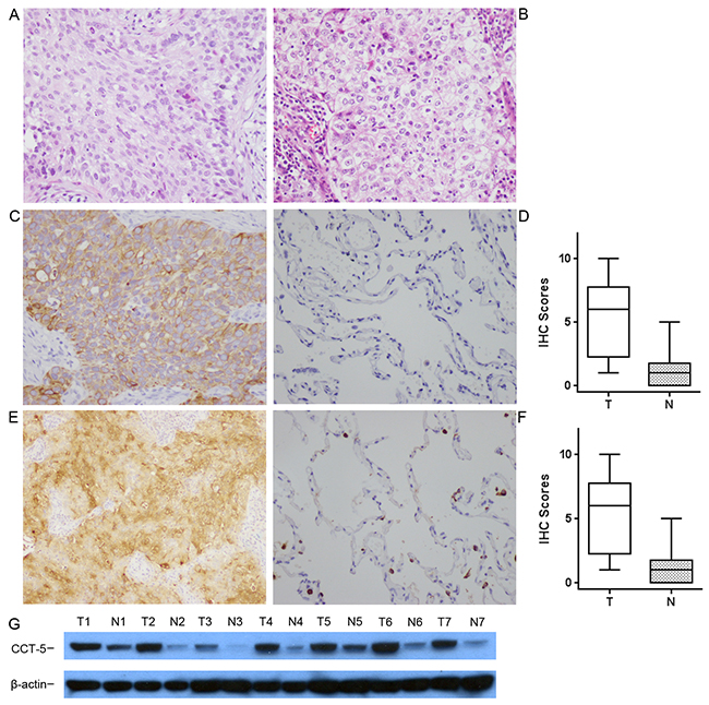 Figure 4: The expression of CCT5 in cancer and non-cancer epithelium were assessed by immunohistochemistry with monoclonal antibodies. (A) Squamous cell lung carcinoma and (B) lung adenocarcinoma were stained with hematoxylin and eosin. Expression of CCT5 was observed mainly in the cytoplasm of squamous cell lung carcinoma (C) and lung adenocarcinoma (E), but was not detected in normal epithelium (D), or was expressed much more weakly (F). Expression of CCT5 was confirmed by Western blot (G) in paired tumor and non-tumor tissues. The representative results were showed that the expression of CCT5 was significantly higher in tumor tissues (T1-T7) than that in normal lung tissues (N1-N7). The right box plots represent the statistical distribution of IHC scores for CCT5 in squamous cell lung carcinoma (top, P<0.01) and in lung adenocarcinoma (bottom, P<0.01). All images are presented at 200x magnification.