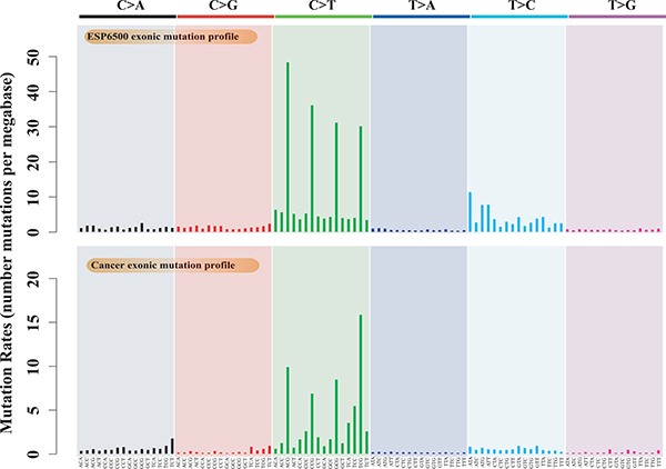 We counted all somatic mutations in the protein-coding regions of the 9,155 tumor-normal paired cancer samples, as well as all the rare protein-coding variants of the ESP6500 dataset. The mutation profiles were depicted as the mutation rate of each mutation type according to the 96 substitution classifications.