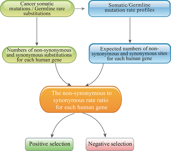 We therefore formulated an evolutionary approach that was designed specifically to estimate the selective pressure imposed on human genes in cancer cells and then identify genes that had undergone positive and purifying selection in cancer cells compared with in normal cells (see Figure 2 for an illustration). In cancer genomics, distinguishing synonymous from nonsynonymous somatic mutations is straightforward. We developed the mutation-profile-based method to estimate the CN/CS ratio of each human gene based on the mutation profiles of cancer somatic mutations and the pN/pS ratio for germline substitutions. In contrast to the equal-rate method [27], our method considers differences in substitution rates and uses the overall mutation rate profile as the weight matrix (Figure 1).