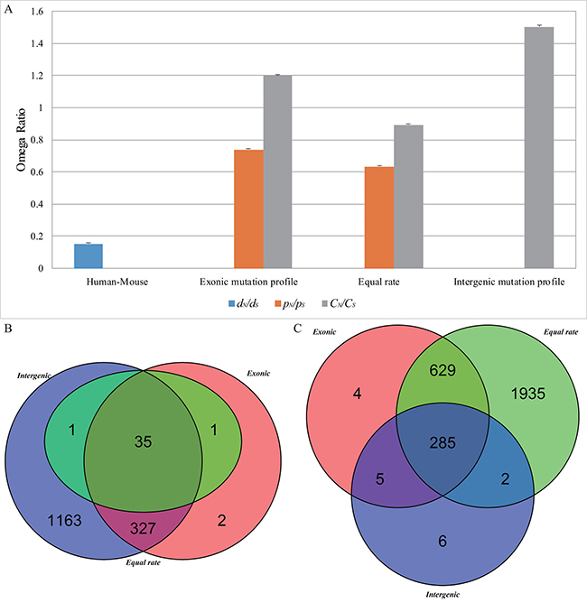 Figure 3: The overall omega ratio (A) and overlap of cancer positively selected (B) and negatively selected (C) genes based on different models.