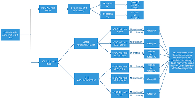 Figure 3: Flow chart of diagnosis of diseases with abnormal sFLC ratio. Group A, malignant plasma diseases; Group B, MGUS; Group C, reactive plasma diseases; MGs, monoclonal gammopathies; AL, primary amyloidosis; NSMM, non-secretory multiple myeloma; M protein (+), SPE assay or sIFE assay shows M protein is positive; M protein (-), both SPE assay and sIFE assay show M protein are negative.