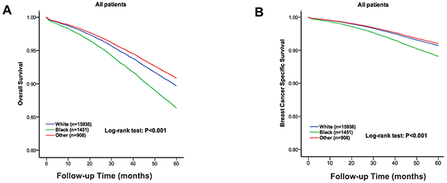 The clinicopathological characteristics were compared between the different race groups using Pearson’s Chi-square tests. The Kaplan-Meier method was performed to generate the five-year OS curves and the BCSS curves, and a log-rank test was performed to compare the differences between the curves. Adjusted HRs with 95% CIs were calculated using Cox proportional hazard regression models in order to estimate the prognostic factors.