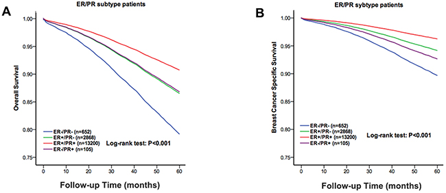 The hormone receptor is a known prognostic factor for OS and BCSS. To further investigate the effects of molecular subtype on ILC and the outcomes among the different races of patients, we stratified all the cases according to their ER and PR status. The Kaplan-Meier analysis showed that the ER-/PR- subtype had the worst five-year OS and BCSS among the four subtypes.