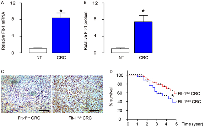 CRC specimens with higher Flt-1 associate with poor patient survival