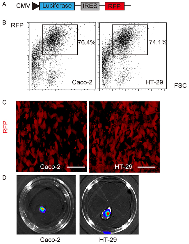 Figure 2: Expression of luciferase and RFP reporter in 2 CRC cell lines. (A) Illustration of a lentivirus carrying both luciferase and red fluorescent protein (RFP) reporter under the control of a CMV promoter (Le-CMVp-LUC-RFP). (B) Two human CRC cell lines Caco-2 and HT-29 were transduced with Le-CMVp-LUC-RFP, after which the RFP+ cells from both lines were purified with flow cytometry, based on RFP. (C) The purified transduced cells were red fluorescent in culture. (D) The transduced cells were readily detectable after exposed to luciferin in culture. Scale bars are 20 μm.