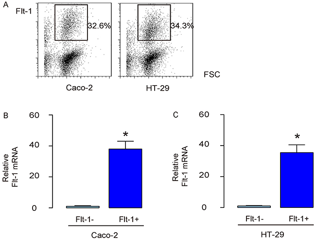 Figure 3: Separation of Flt-1+ vs Flt-1- cells. (A) Flt-1 was used as a surface marker to separate Flt-1+ vs Flt-1- populations from the transduced CRC cells using flow cytometry. (B-C) RT-qPCR for Flt-1 in Flt-1+ vs Flt-1- populations from the transduced Caco-2 cells (B), and in transduced HT-29 cells (C). *p<0.05. N=5.
