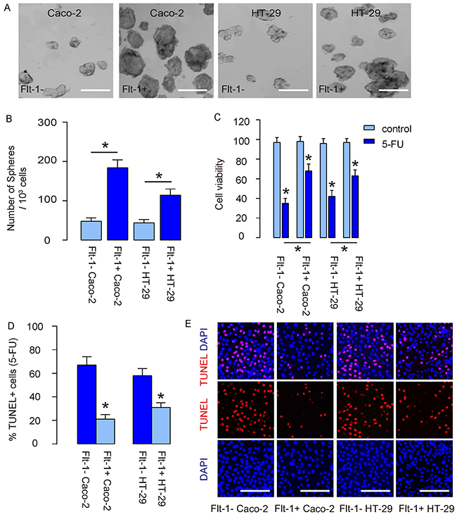 Figure 4: Flt-1+ CRC cells demonstrate CSC properties in vitro. (A) Tumor sphere formation assay for Flt-1- and Flt-1+ cells from both lines, shown by representative images (A), and by quantification (B). (C-E) Flt-1- and Flt-1+ cells from both lines were exposed to fluorouracil (5-FU). (C) CCK-8 assay for cell viability. (D-E) TUNEL assay for cell apoptosis, shown by quantification (D), and by representative staining images (E). *p<0.05. N=5. Scale bars are 100 μm.