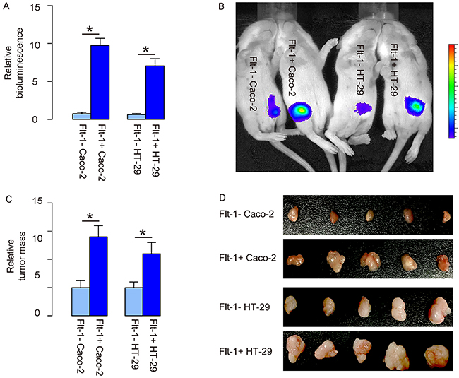 Figure 5: Transplanted Flt-1+ CRC cells generate bigger tumor vs Flt-1- CRC cells. (A-D) Same number (106) of Flt-1- and Flt-1+ cells was subcutaneously transplanted into nude mice, and the tumor formation was monitored after luciferin injection 8 weeks after tumor implantation. (A-B) Tumor size was analyzed by quantification of bioluminescence (A) and shown by the representative bioluminescent images (B). (C-D) Tumor mass after resection was measured, showing by quantification (C), and by gross images (D). *p<0.05. N=5.