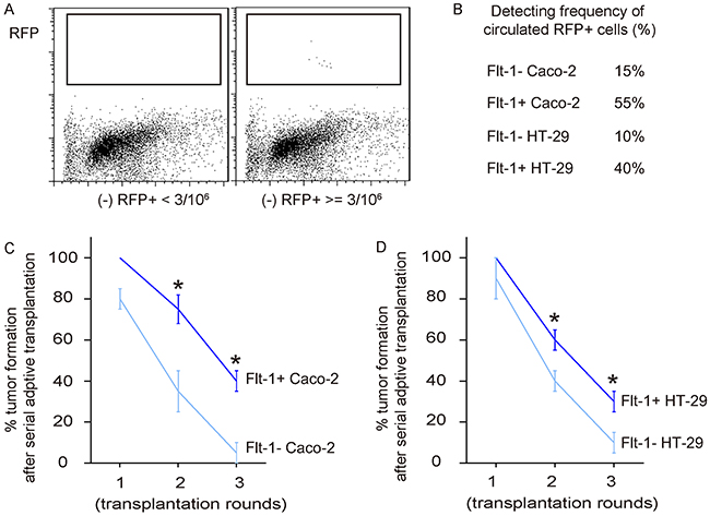 Figure 6: Flt-1+ CRC cells generate tumor more often than Flt-1- CRC cells after serial adoptive transplantation. (A) Presence of RFP+ tumor cells in mouse blood 8 weeks after subcutaneous tumor cell transplantation by flow cytometry. Criteria was here: In 106 blood cells that have deprived of red blood cells, if more than 3 RFP+ cells are detected, the case is regarded as a positive one. Otherwise, the case is regarded as a negative one. Representative flow charts for positive and negative cases were shown. (B) Frequency of detection of tumor cells in the circulation. (C-D) Finally, 20 tumor cells were isolated from the primary tumor developed from either Flt-1- and Flt-1+ cells, and were transplanted back to new nude mice. The new tumor formation was verified by bioluminescence. After 8 weeks, the newly formed tumors were dissected out and isolated 20 tumor cells were used for the second round of transplantation. Totally, 3 rounds of transplantation were performed and the formation of tumor was recorded throughout the experiment. Frequency of developing tumor by Caco-2 cells (C) and by HT-29 cells (D) were shown. *p<0.05. N=30.