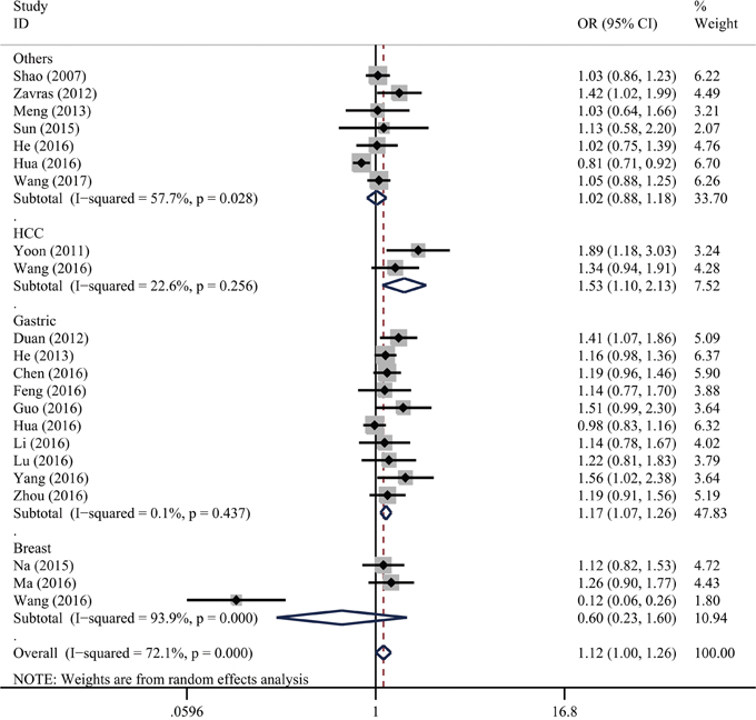 Two authors (Haixia Zhou and Ting-Yan Shi) performed the publication search and data extraction independently. The extracted information includes surname of the first author, publication year, cancer type, country of origin, ethnicity, genotyping methods, and numbers of cases and control subjects with rs751402 CC, CT and TT genotypes. We assessed the quality of each publication based on the quality score assessment [44]. All contradictory information was discussed and resolved through consensus when necessary.