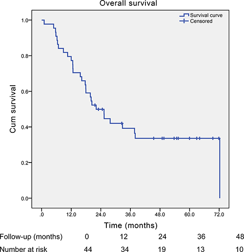 From January 2009 to January 2015, a total of 3212 patients were recorded to undergo esophagectomy with lymphadenectomy for esophageal cancer in our department, 44 (accounting for 1.4% of all esophageal cancers) of which were SCCE. The baseline characteristics of those SCCE patients were shown in Table 1. The mean age of those patients were 59.9 ± 8.7 years old (ranging from 42 to 76 years) with a male to female ratio of 3:1. The majority of the esophageal NEC were located in the middle (61.4%) segment of the esophagus. For pathological findings, 15 patients were found to have mixed SCCE, which were all mixed with esophageal squamous cell carcinoma. Six patients were proved to have lymphovascular invasion. Because those patients were preoperatively diagnosed as clinical stage I or stage II disease, none of them received any neoadjuvant therapy, and all of them were intended for radical resection with two-field lymphadenectomy. Because of the historical background of choosing left thoracotomy as a predominant approach to esophageal cancer in China, 40 patients underwent left thoracotomy with two-field lymphadenectomy, while 4 patients received right thoracotomy with two-field lymphadenectomy. All those patients underwent R0 resection with negative resection margins. According to the 2009 AJCC TNM staging system, ten patients were at pathological stage I, 17 at stage II, and 17 at stage III. Postoperatively, more than half of those patients received adjuvant therapy (chemotherapy and/or radiotherapy). All those patients were estimated to have a Ki-67 index of more than 20%, and twenty-eight patients were found to have a Ki-67 index of more than 50% (high expression of Ki-67).