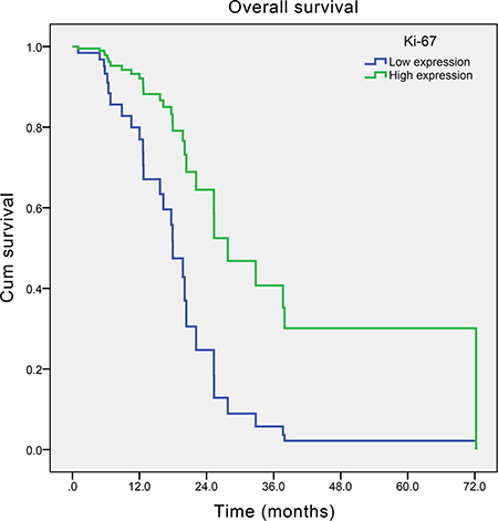 The correlation between Ki-67 index and clinicopathological characteristics of SCCE was shown in Table 2. There was no obvious correlation between Ki-67 expression and the age, gender, tumor location, histology homology, Lymphovascular invasion, pT stage, and pN stage of SCCE. Moreover, the numbers of patients receiving adjuvant therapy were comparable between high Ki-67 expression group and low Ki-67 expression group.