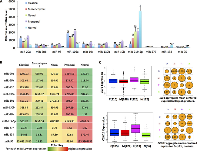 Figure 1: In silico analysis of the expression of selected miRNAs from the miR-17~92 cluster and paralogs shows elevated expression in proneural GBM. (A) Expression level of miR-17~92 and paralog miRNAs in the four subtypes of GBM versus normal brain tissues. Classical, n = 53; Mesenchymal, n = 58; Neural, n = 33; Proneural, n = 57; Normal, n = 10. The difference was analyzed between proneural and the other three subtypes or normal brain tissues. #p < 0.05; *p < 0.01; **p < 0.001; ***p < 0.0001; NS, not significant. Data are from TCGA and adapted from Project Betastasis: http://www.betastasis.com/glioma/tcga_gbm. (B) Heat map of the miR-17~92 family expression level in the four subtypes of GBM versus normal brain tissues based on the data shown in panel A. The number denotes the relative expression level of each miRNA in the four subtypes of GBM and normal brain tissues. (C) Expression of E2F1 and CCND1 in the four subtypes of GBM. C: classical; M: mesenchymal; P: proneural; N: neural. The sample number is shown in the left panel. The p values comparing across subtypes are shown in the right panel. Data are adapted from the Glioblastoma Bio Discovery Portal: https://gbm-biodp.nci.nih.gov.