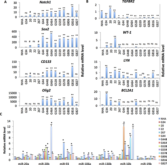Figure 2: Expression of PN markers and the miR-17~92 family is elevated in a set of PN GSC lines. (A and B) RT-qPCR analysis of the markers for PN GBM (A, OLIG22, SOX2, CD133 and NOTCH1) and MES GBM (B, TGFBR2, WT-1, LYN and BCL2A1) in the GSC lines and normal human astrocytes (NHA). n = 3. NS, not statistically significant; #p < 0.05; *p < 0.01; **p < 0.001; as compared to the expression level in NHA. (C) qPCR analysis of the expression of miR-17~92 family miRNAs and paralogs in the GSC lines and NHA. n = 3. *p < 0.01, as compared to the expression level in NHA. Shown are representative data of three independent experiments with similar results.