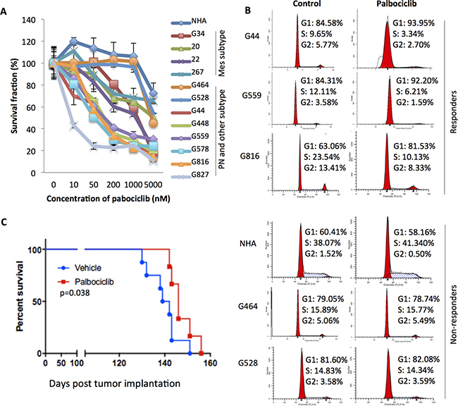 The impact of palbociclib treatment on cell cycle distribution was also analyzed using flow cytometry. In the most sensitive PN lines, palbociclib induced accumulation of cells in G1 phase (Figure 3B). In contrast, CDK4/6 inhibition failed to induce G1 arrest in the three resistant lines, NHA, G464, or G528 (Figure 3B). Moreover, daily oral palbociclib treatment (150 mg/kg) significantly increased survival in mice with established intracranial xenografts of the PN GSC line G448, one of the few PN lines showing tumorigenicity in vivo (Figure 3C). Taken together, GSC lines exhibited differential sensitivity to the CDK4/6 inhibitor, with most PN GSCs more sensitive to palbociclib than GSCs of other subtypes.