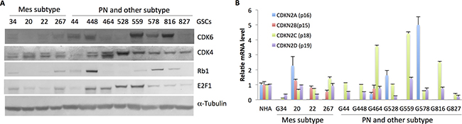 Figure 4: Molecular features of the GSC lines suggest associations with sensitivity and resistance. (A) Immunoblot analysis of CDK4, CDK6, Rb1, and E2F1 in the GSC lines. α-Tubulin was used as a loading control. (B) qPCR analysis of p15, p16, p18, and p19 expression levels in the GSC lines and NHA.