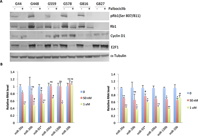 Figure 5: Palbociclib reduces Rb1 phosphorylation and miR17~92 and paralog expression in the responder PN GSCs. (A) Immunoblot analysis of Rb1, phospho-Rb1 (Ser 807/811), Cyclin D1, and E2F1 in the palbociclib (1 μM, 24 hr) -treated GSCs. α-Tubulin was used as loading control. (B) qPCR analysis of miR-17~92 and paralog expression in G44 (left panel) and G559 (right panel) treated with the indicated doses of palbociclib for 5 days. n = 3. Differences were analyzed between the control and the palbociclib-treated groups. NS: not statistically significant; #p < 0.05; *p < 0.01: **p < 0.001. Shown are representative data of three independent experiments with similar results.