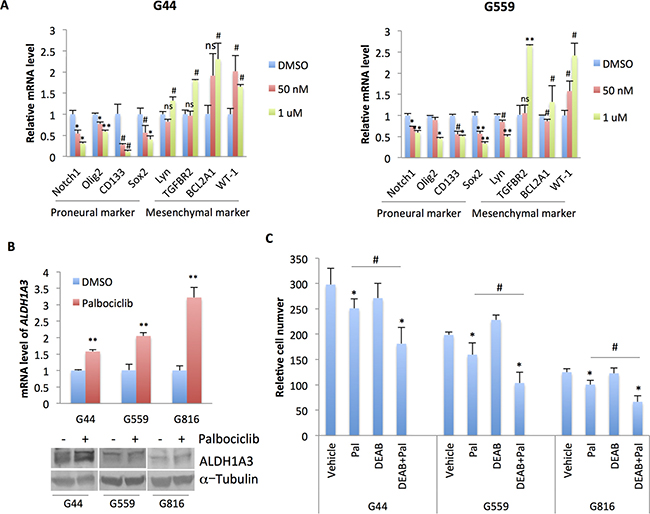 Figure 6: Palbociclib induces a potential transition of PN GSCs to MES GSCs. (A) qPCR analysis of markers of PN and MES subtypes in G44 and G559 treated with the indicated doses of palbociclib for 5 days. n = 3. Differences were analyzed between the control and the palbociclib-treated groups. NS: not statistically significant; #p < 0.05; *p < 0.01; **p < 0.001. (B) qPCR and immunoblot analysis of ALDH1A3 in three independent PN GSC lines that were treated with 10 nM of palbociclib for 5 days. n = 3. Differences were analyzed between the control and the palbociclib-treated groups. NS: not statistically significant; #p < 0.05; *p < 0.01; **p < 0.001. (C) Cell proliferation analysis of three independent PN GSC lines that were treated with palbociclib (10 nM), DEAB (25 μM), or both for 5 days. The cells were cultured on a laminin (10 μg/ml in poly ornithine)-coated 96-well plate. Cell number was determined by CyQUANT Direct Cell Proliferation assay. n = 3. *p < 0.05, comparison between palbociclib or DEAB treatment with the vehicle control; #p < 0.05, comparison between combination group with palbociclib treatment. G44, CDI = 0.79; G559, CDI = 0.565; G816, CDI = 0.677. Shown are representative data of three independent experiments with similar results.