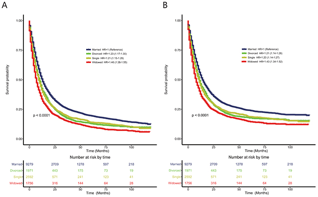 Several limitations of our study should be discussed. First, the marital status analyzed in our study was defined at the initial diagnosis of each tumor and might have changed during follow-up periods. We could not adjust this bias because the SEER database only included information about marital status at the time of diagnosis. Second, detailed information about the patients’ therapies, such as chemotherapy and therapy quality, was not provided. Third, only legally married patients were classified as married, which meant that cohabitating patients were not recorded as married, biasing our results. According to the 2010 US Census, approximately 90 million unmarried individuals were cohabitating with other people, whereas only about 30 million (25%) lived alone. Fourth, patients with unknown clinicopathological characteristics were excluded from our analysis, causing selection bias. However, this problem was addressed to some extent by the use of PSM in our study. Fifth, our matching procedure resulted in the inclusion of only 38% (5,972/15,598) of the original cohort.