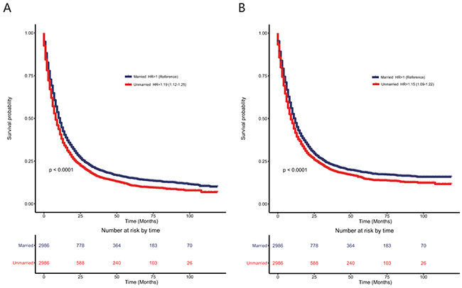 Figure 3: Kaplan–Meier survival plots in patients with esophageal cancers in the matched cohort with 2,986 unmarried and 2,986 married patients according to marital status (A) overall survival; (B) esophageal cancer cause-specific survival.