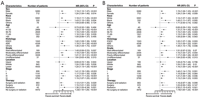 Figure 4: Forest plot presenting the contribution of unmarried status compared with that of married status to the survival rates of patients in the subgroups of the matched cohort according to different clinicopathological factors (A) overall survival; (B) esophageal cancer cause-specific survival. HR > 1 with P < 0.05 meant that unmarried status contributed significantly to poorer survival than married status.