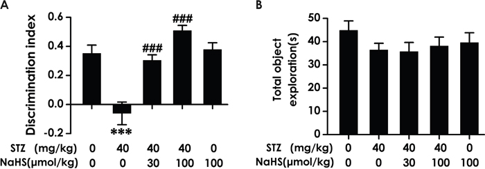 The NOR test on the basis of the differential exploration of familiar and new objects [41], and it is used to study short-term, declarative memory and attention. In the present study, we showed that in NOR, rats treated with STZ displayed a decreased discrimination index, which also indicates the cognitive dysfunction. Furthermore, the protective action of H2S in diabetic cognitive dysfunction was further supported in novel object recognition test. Administration of H2S dose dependently upregulated the discrimination index of diabetic rats in the novel object recognition test.