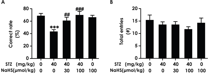 As an alternative method to confirm H2S whether ameliorates working memory dysfunction, we applied the Y-maze test to assess the changes of diabetic rats in working memory functions after treatment with NaHS. Diabetic rats demonstrated an obvious decline in the correct rate compared to blank group; however, treatment of STZ-induced diabetic rats with NaHS inversed the descend in the correct rate compared to those in STZ-treated alone rats (F4,30=6.218, P < 0.001; Figure 2A). It should be noted that NaHS (100 μmol/kg/d, i.p.) did not affect the correct rate of rats in control group (Figure 2A). In addition, the total number of entries has no difference in various groups (F12,22=0.992, P > 0.05; Figure 2B). These data also indicated that NaHS reverses the working memory dysfunction of diabetic rats.