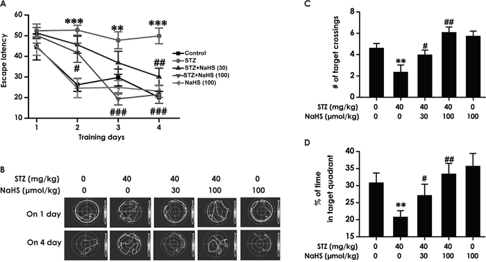 Figure 3: Effects of NaHS on the spatial learning and memory dysfunction of STZ-induced diabetic rats in the acquisition and probe phase of Morris water maze test. Rats were once injected with STZ (40 mg/kg) and treated with NaHS (30 and 100 μmol/kg/d, ip) for 30 days. The cognitive performance of rats was test using the Morris water maze task. (A) Acquisition profiles: rats were submitted to acquisition of an invisible platform placed in a fixed location (target quadrant) with four swims per day during 4 days. (B) Representative swimming tracks of rats searching for the underwater platform at 1st and 4th training day. (C, D) One day after finishing the place navigation task (day 5), the platform was removed and the rats were submitted to the probe trial, and the percentage of time spent in the target quadrant (C) and the number of times that the animal crossed the target quadrant platform area (D) were analyzed. The data are expressed as the mean ± S.E.M. (n=7-12). **P< 0.01, ***p< 0.001, versus control group; #P< 0.05, ##P<0.01, ###P< 0.001, versus STZ-treated alone group.