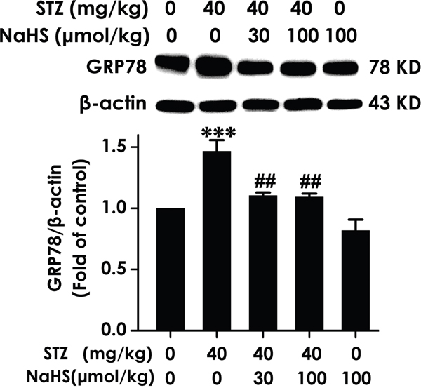 Figure 6: Effect of NaHS on the expression of GRP78 in the hippocampus of STZ-induced diabetic rats. Rats were once injected with STZ (40 mg/kg) and treated with NaHS (30 and 100 μmol/kg/d, ip) for 30 days. The expression of GRP78 in the hippocampus of rats was detected by Western blot using anti-GRP78 antibody and β-actin was used as a loading control. Values are expressed as the mean ± S.E.M. (n=3-5). ***P < 0.001, versus control group; ##P < 0.01, versus STZ-treated alone group.