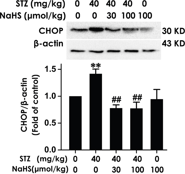 Figure 7: Effect of NaHS on the expression of CHOP in the hippocampus of STZ-induced diabetic rats. Rats were once injected with STZ (40 mg/kg) and treated with NaHS (30 and 100 μmol/kg/d, ip) for 30 days. The expression of CHOP in the hippocampus of rats was detected by Western blot using an anti-CHOP antibody and β-actin was used as a loading control. Values are expressed as the mean ± S.E.M. (n=3-5). **P < 0.01, versus control group; ##P < 0.01, versus STZ-treated alone group.