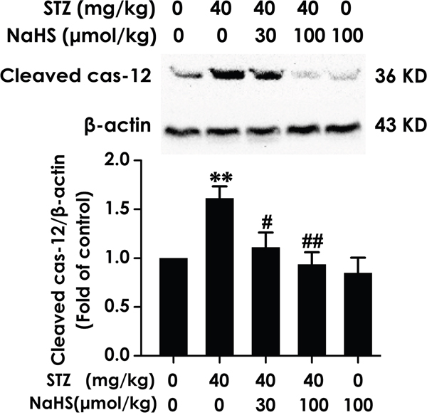 Figure 8: Effect of NaHS on the expression of cleaved caspase-12 in the hippocampus of STZ-induced diabetic rats. Rats were once injected with STZ (40 mg/kg) and treated with NaHS (30 and 100 μmol/kg/d, ip) for 30 days. The expression of cleaved caspase-12 in the hippocampus of rats was detected by Western blot using an anti-cleaved caspase-12 antibody and β-actin was used as a loading control. Values are expressed as the mean ± S.E.M. (n=3-5). **P < 0.01, versus control group; #P < 0.05, ##P < 0.01, versus STZ-treated alone group.