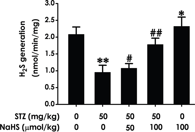Figure 9: Effect of NaHS on the generation of hippocampal H2S in STZ-induced diabetic rats. Rats were once injected with STZ (40 mg/kg) and treated with NaHS (30 and 100 μmol/kg/d, ip) for 30 days. The generation of hippocampal of rats was assayed by sensitive sulphur electrode. Values are expressed as the mean ± S.E.M. (n=3-5). *P< 0.05, **P < 0.01, versus control group; #P < 0.05, ##P < 0.01, versus STZ-treated alone group.