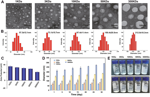 Figure 1: Characterization of 1, 3, 10, 50, 300 KDa OC. (A) TEM images and the corresponding size distribution histograms (B) of the OC with different molecular weights. (C) Zeta Potential of as-prepared OC. (D) The size distribution histograms of different molecular weight OC after 30 days’ storage. (E) The photograph of as-prepared OC before (up) and after (down) 30 days’ storage.