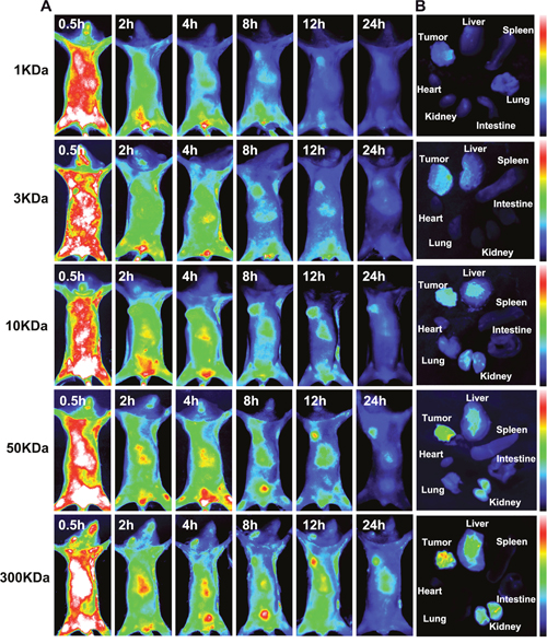 To investigate the relationship between tumor size and in vivo distribution of OC (10KDa), the tumor models with different tumor diameters (3, 5 and 10 mm) were intravenously injected with 10KDa OC. As shown in Supplementary Figure 7, the larger tumor size model showed the brighter fluorescence signal in tumor, while the fluorescence intensity declined with the reduction of tumor size. Although tumor size indeed impacted on the tumor accumulation efficacy of nanocarriers, all the groups showed obvious tumor accumulation starting from 8 h.