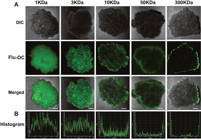 The culture of 3D tumor spheroids was different from that of solid tumors. The 3D tumor spheroids were cultured in 96-well plates containing Flu-OC for fluorescence imaging. However, for in vivo imaging, Flu-OC were injected through tail intravenous, and accumulated into solid tumors through Enhanced Permeation Retention (EPR) effect. And the diameter of tumor spheroids and the solid tumors was different, therefore, the treated time of these two models was also different. The tumor spheroids were incubated with Flu-OC with different molecular weights for 8 h. Subsequently, the tumor spheroids were washed with PBS and imaged using LSCM. The fluorescence intensity profiles of tumor spheroids were measured by ROI analysis using Olympus FV1000.