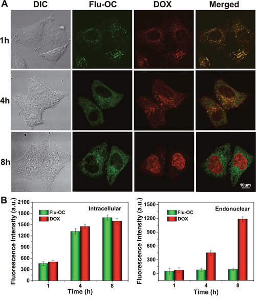 DOX/ Flu-OC with different molecular weight was incubated with MCF7 cells laser scanning confocal microscope culture dishes for 1h,4h and 8h. The fluorescence signals of DOX and Flu-OC were detected using LSCM to evaluate the drug release in tumor cells. The intensity of two fluorescent signals in cells and nuclear was analyzed using Olympus FV1000.