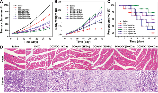 The MCF7 tumor-bearing mice were randomly divided into seven groups (n=20) and separately treated with saline, DOX, DOX/OC (1KDa), DOX/OC (3KDa), DOX/OC (10KDa), DOX/OC (50KDa), DOX/OC (300KDa). The group treated with saline was used as control. The other groups maintained a dose of 5 mg/kg equivalent DOX in each mouse. The tumor volume was measured every 5 days. The body weight and the survival rate was also monitored over 30 days. To further investigation, the tumor and heart of the seven groups were excised for pathological analysis.