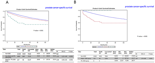 As with all observational population-based studies, the present study has several limitations. First, although we adjusted for various potential covariates and ICD codes, variables such as lifestyle factors that affect ESRD were not included or routinely captured in a National Institutes of Health (NIH) database, because the database did not capture patients outside of the NIH system. Second, the medical therapies and ESRD patients with failed renal transplantation were not evaluated in terms of survival. Third, any information on the nuclear grades of PC was not obtained, which is important for determining the aggressiveness of PC. Fourth, because of fundamental limitations of this study using huge data with unavailability of clinico-pathological characteristics of patients, including the severity of the disease and tumor burden status in this study. Further prospective studies are needed to verify the poorer survival outcome in, both, OS and CSS in patients with radical prostatectomy found in this study. All the significant prognostic survival factors (OS and CSS), such as Gleason score, treatment interval time after diagnosis, and non-adenocarcinoma pathology were not evaluated in this study because of their unavailability in the National health database.