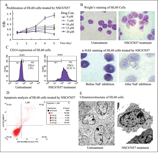Figure 1: NSC67657 induces monocytic differentiation of HL60 cells. (A) HL60 cells (1×105 cells/ml) were incubated at 37°C for 5 d, with or without various concentrations of NSC67657. Proliferation of HL60 cells was assessed by the MTT assay. Judging from growth and differentiation states of the cells, 10 μM NSC67657 was the optimal drug concentration. (B) After 5 d treatment with NSC67657, HL-60 cells exhibited monocytic differentiation, with irregular nuclei and hypochromatic endochylema (arrow) (Wright’s stain, 400×). By esterase staining, the percent positive staining in the NSC67657 treated group was as high as 81.75±9.22%. This was decreased to 11.7% (inhibition rate > 50%) with NaF treatment (NAE stain, 400×). (C) HL60 cells treated with various differentiation inducers showed a time dependent increase in the proportion of differentiated cells. They were regarded as being completely differentiated after continuous treatment with selected drug concentrations for 5 d. At this time, the proportion of CD14 positive cells in the NSC67657 treated group was greater than 90%. (D) Apoptosis was evaluated by flow cytometry using fluorescein isothiocyanate-labeled annexin V. We found that few cells underwent apoptosis during HL60 cell differentiation. (E) Transmission electron micrographs (13,000 ×) of HL60 cells treated with NSC67657 (10 μM) or untreated. In untreated cells, chromatin was porous with the development of mitochondria. However, in drug treated cells, the heterochromatin was side-concentrated and azurophil granules were widely dispersed throughout the endochylema. Evidence of apoptosis, such as karyopycnosis, apoptotic bodies and vacuoles were not observed in any of the electron microscopic fields examined.